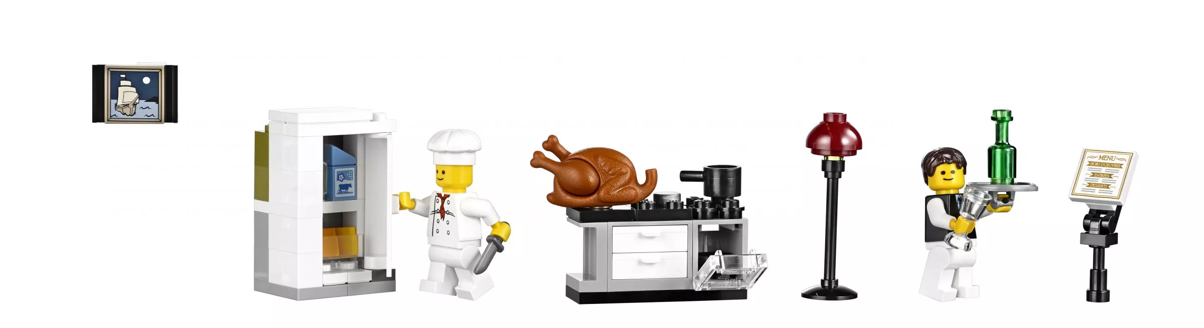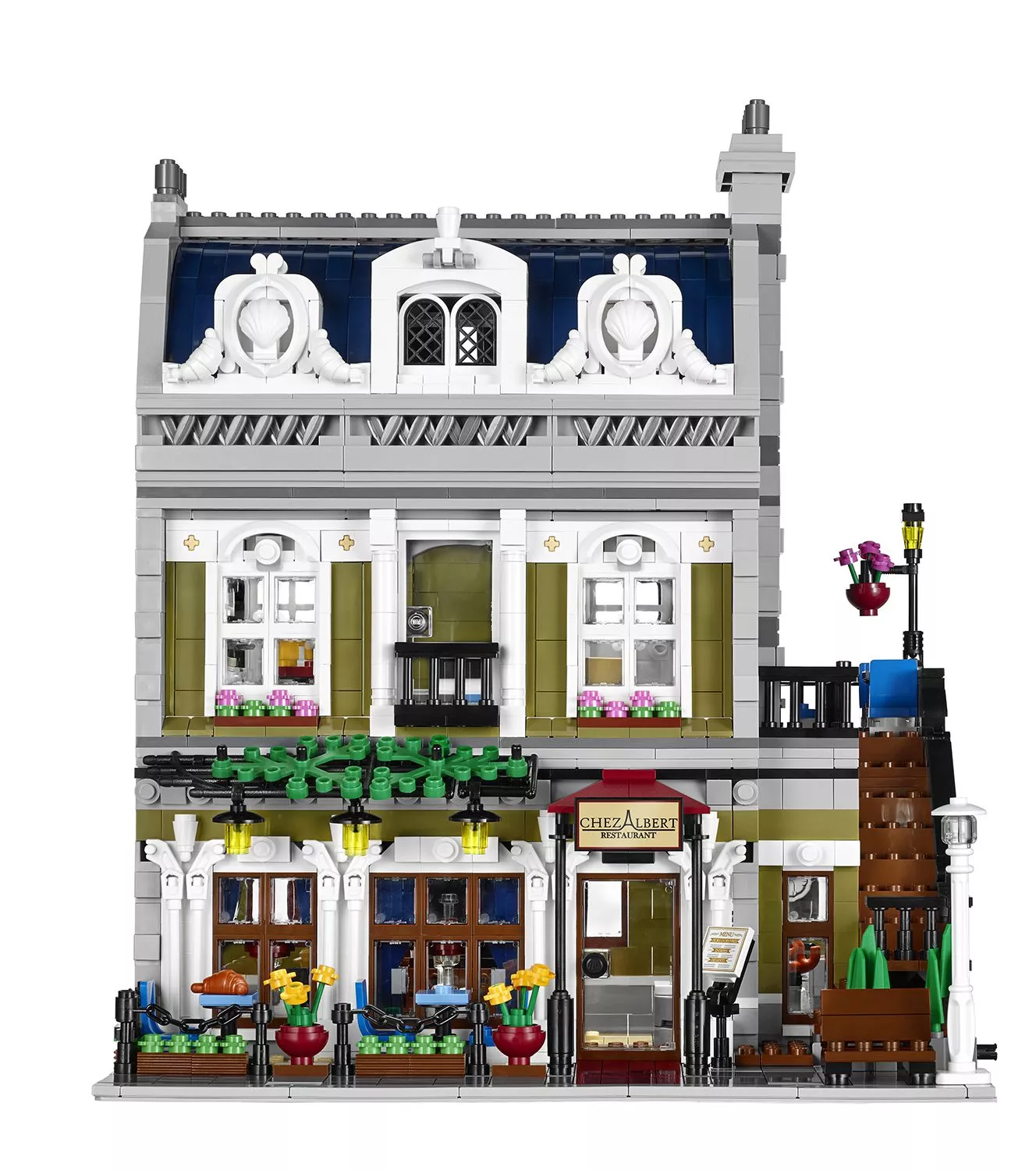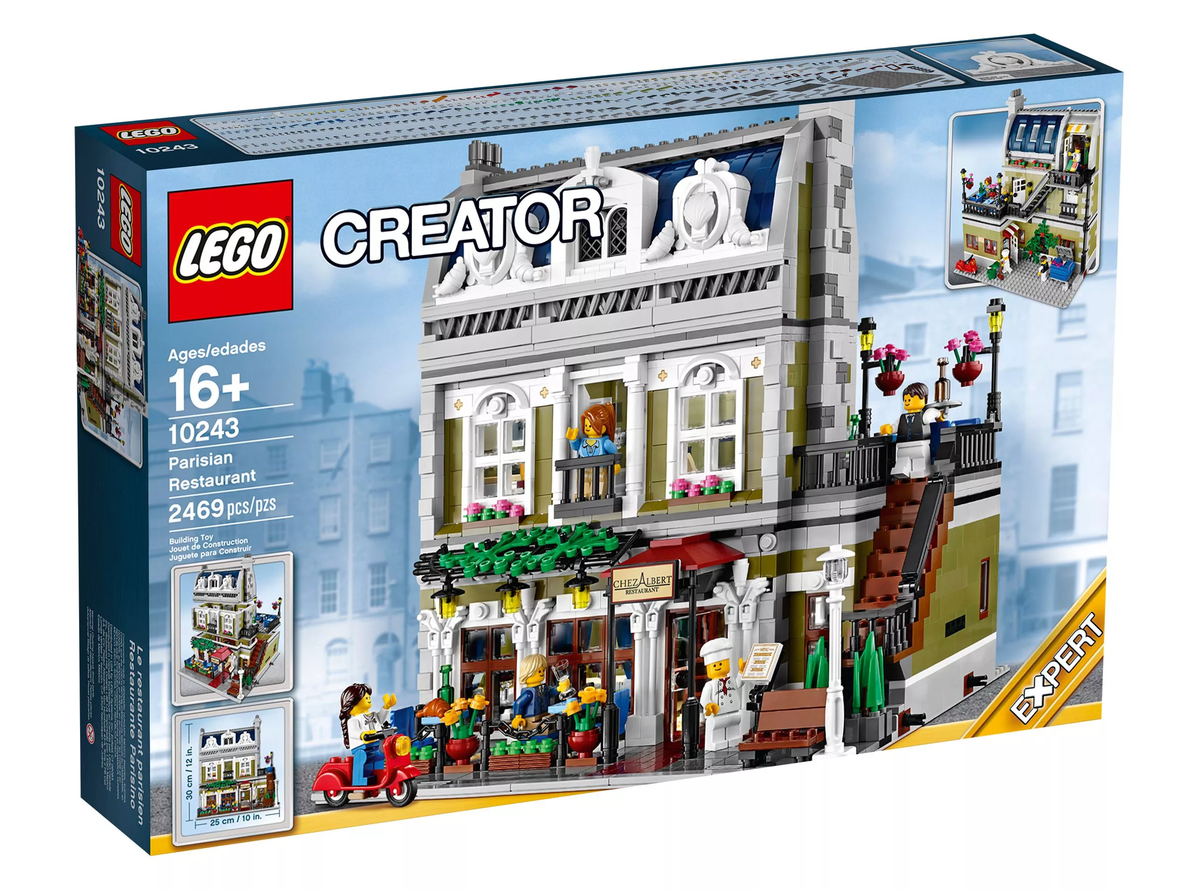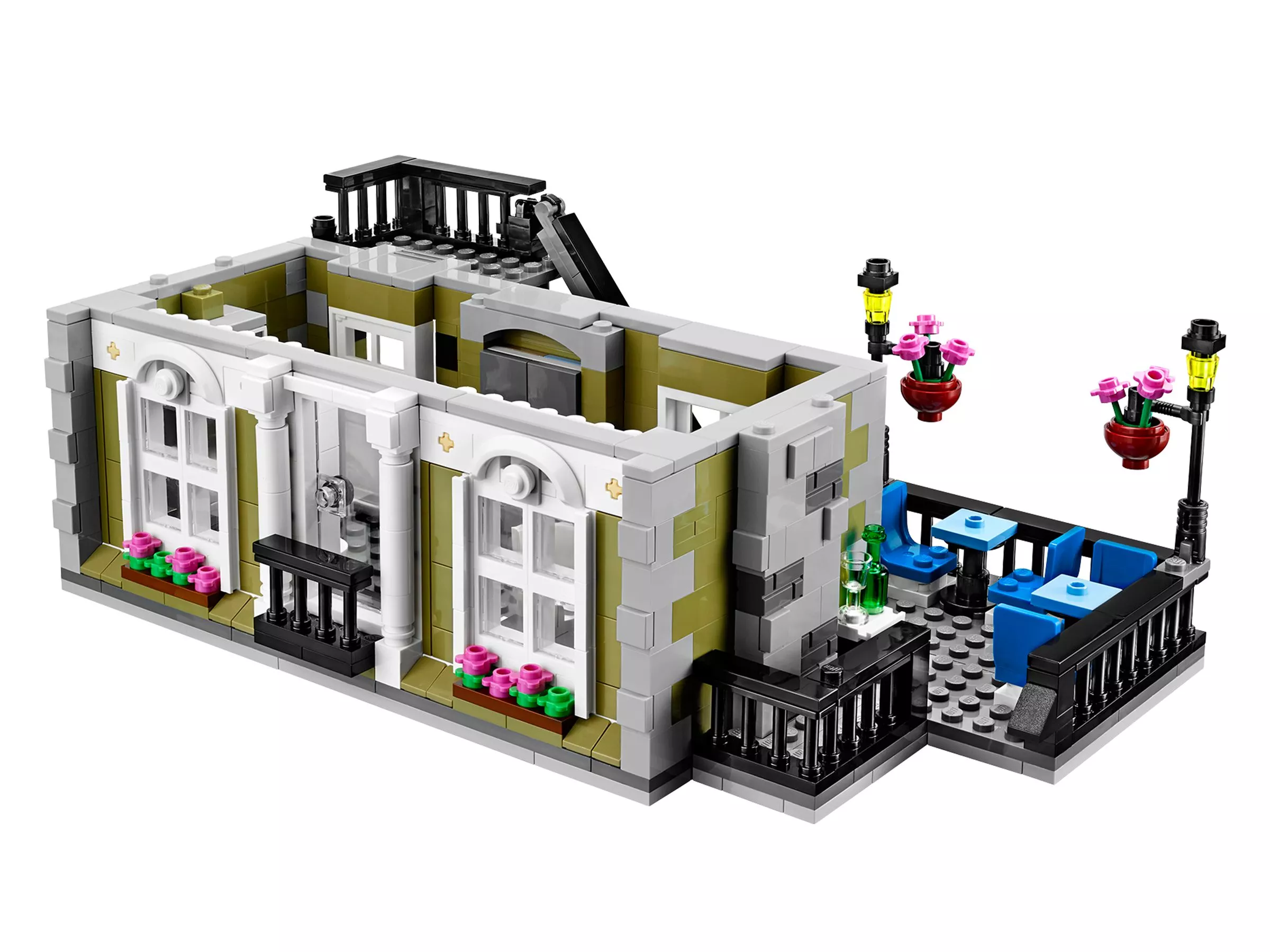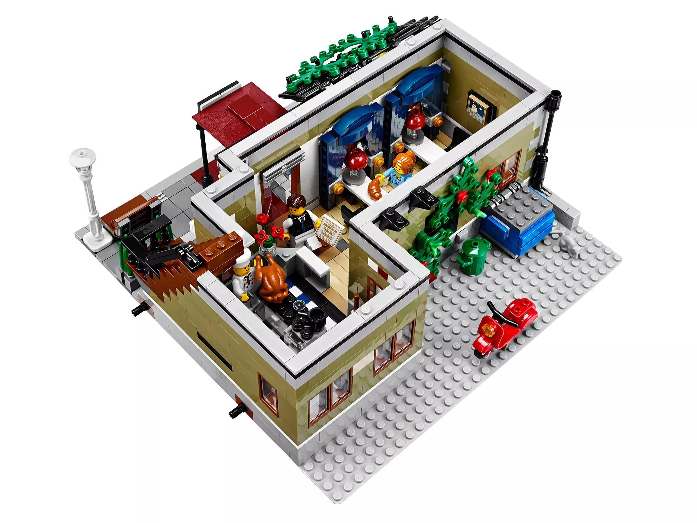 В парижском ресторане очень оживлённо. Снаружи проносится скутер, внутри помещения официант лавирует между столиками, а взволнованный молодой человек готовится сделать предложение руки и сердца! На кухне царит такое же оживление: шеф-повар деловито готовит еду. Это красивое детально выполненное здание – декорация для множества историй. Оно является замечательным дополнением к серии модульных зданий. Парижский ресторан имеет полностью укомплектованную, выложенную плиткой сине-белого цвета кухню со столовыми приборами и уютное помещение со шкафом-кроватью, маленькой кухонькой и камином. На верхнем этаже располагается комната-студия художника, в которой есть чугунный обогреватель, мольберт, кисть и два произведения кисти амбициозного художника. Снаружи лестница ведёт на террасу на крыше, украшенную подвесными фонарями и цветами, где можно пообедать на открытом воздухе. Удивительная модель парижского ресторана включает даже фасад, круассаны, моллюски и перья, которые воссоздают атмосферу Парижа. В набор входят 5 минифигурок: шеф-повар, официант, девушка и романтическая пара.