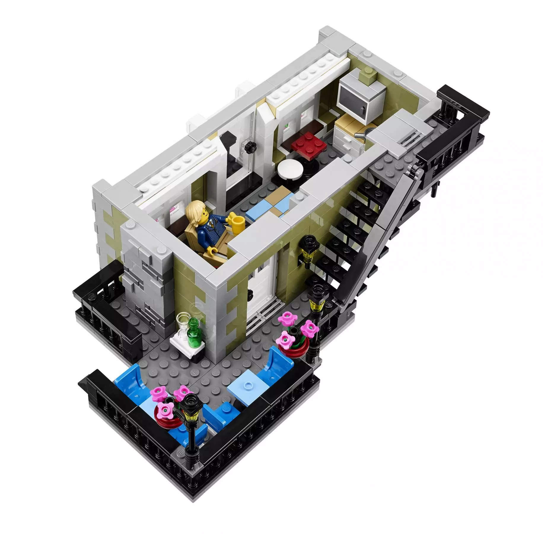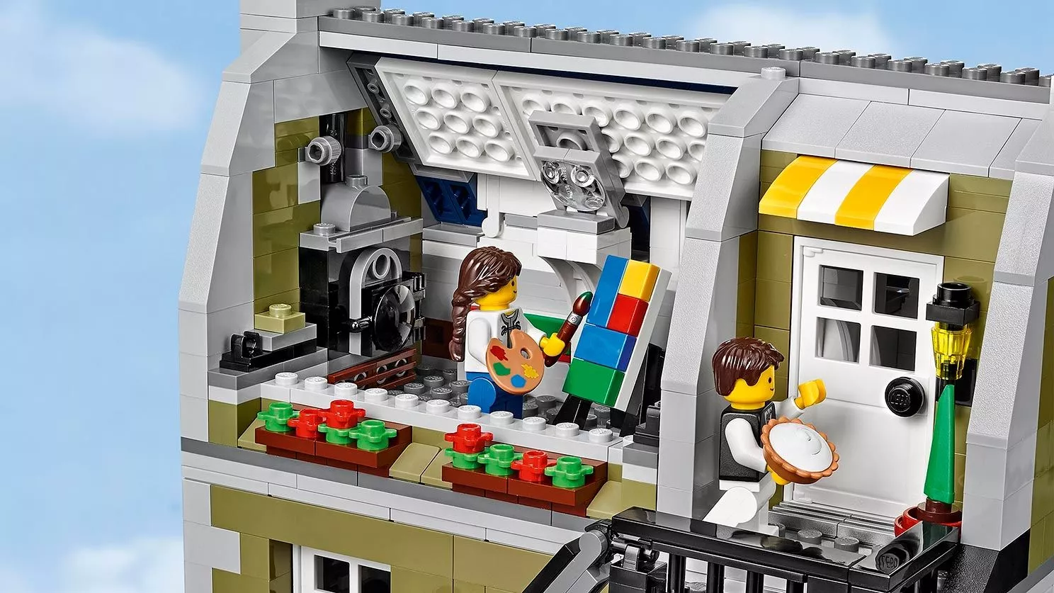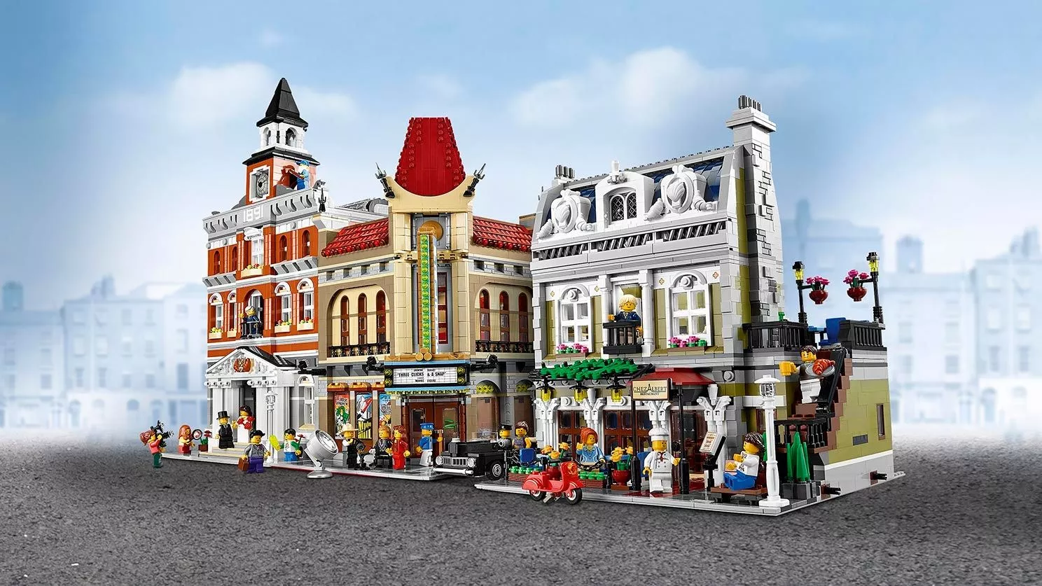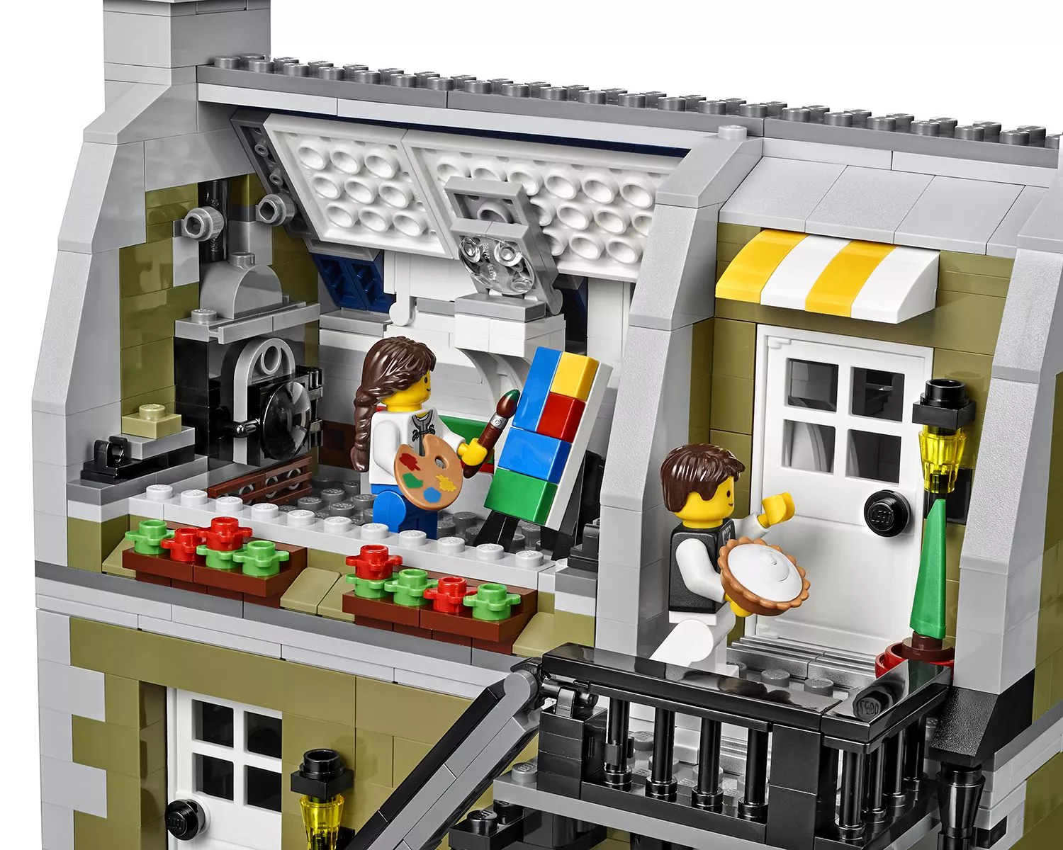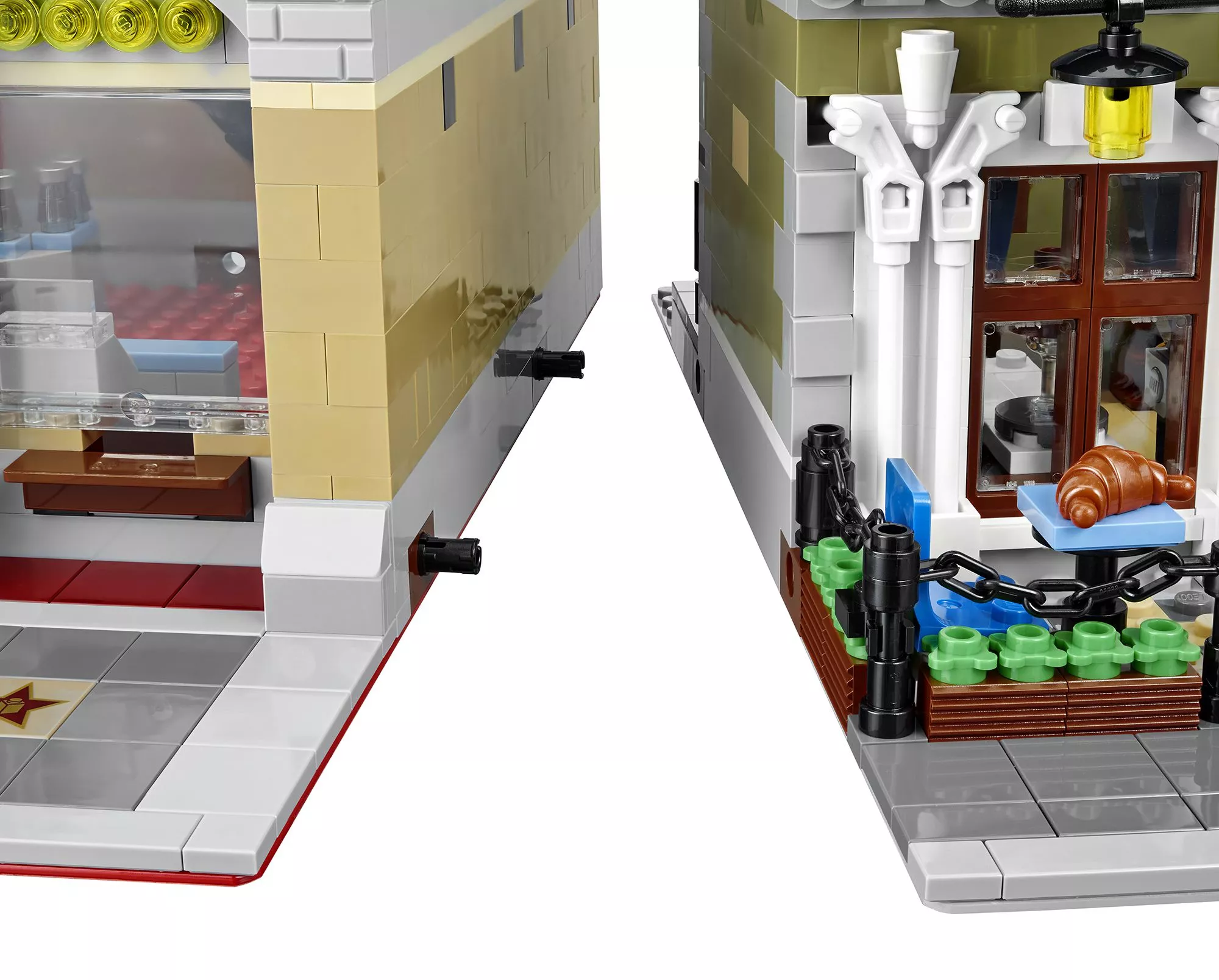 В парижском ресторане очень оживлённо. Снаружи проносится скутер, внутри помещения официант лавирует между столиками, а взволнованный молодой человек готовится сделать предложение руки и сердца! На кухне царит такое же оживление: шеф-повар деловито готовит еду. Это красивое детально выполненное здание – декорация для множества историй. Оно является замечательным дополнением к серии модульных зданий. Парижский ресторан имеет полностью укомплектованную, выложенную плиткой сине-белого цвета кухню со столовыми приборами и уютное помещение со шкафом-кроватью, маленькой кухонькой и камином. На верхнем этаже располагается комната-студия художника, в которой есть чугунный обогреватель, мольберт, кисть и два произведения кисти амбициозного художника. Снаружи лестница ведёт на террасу на крыше, украшенную подвесными фонарями и цветами, где можно пообедать на открытом воздухе. Удивительная модель парижского ресторана включает даже фасад, круассаны, моллюски и перья, которые воссоздают атмосферу Парижа. В набор входят 5 минифигурок: шеф-повар, официант, девушка и романтическая пара.
