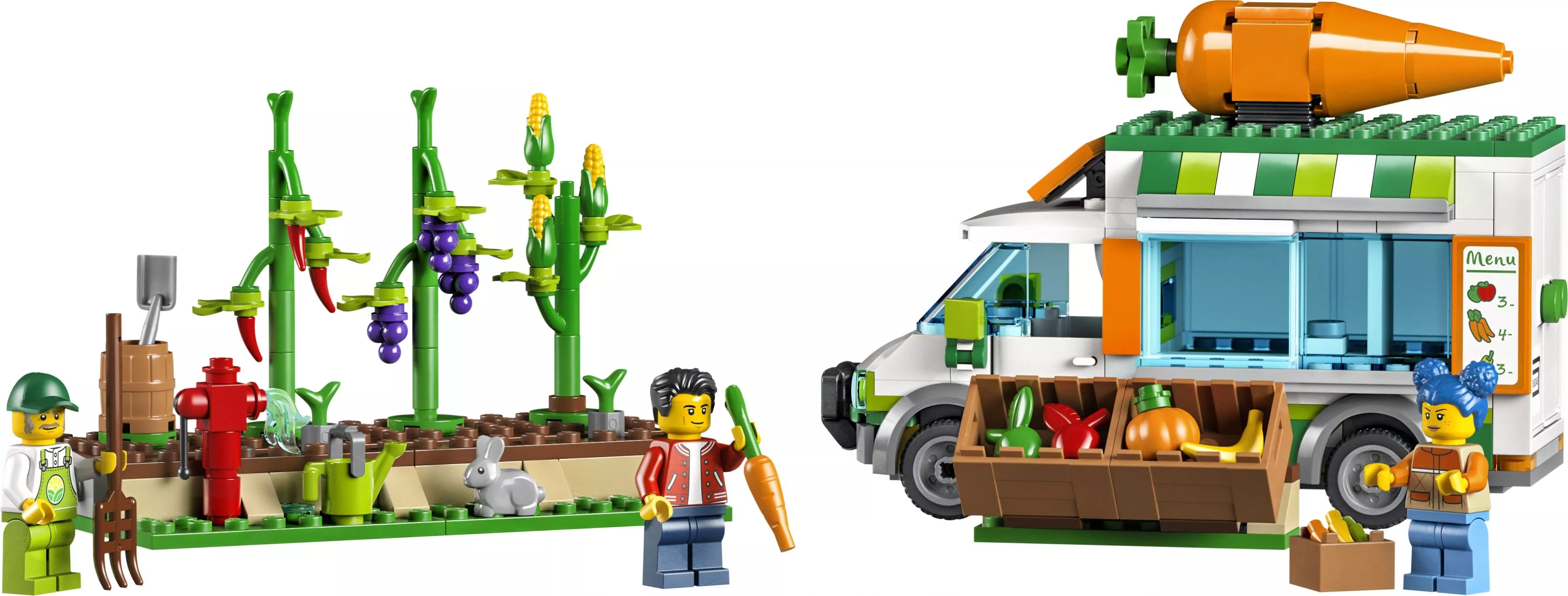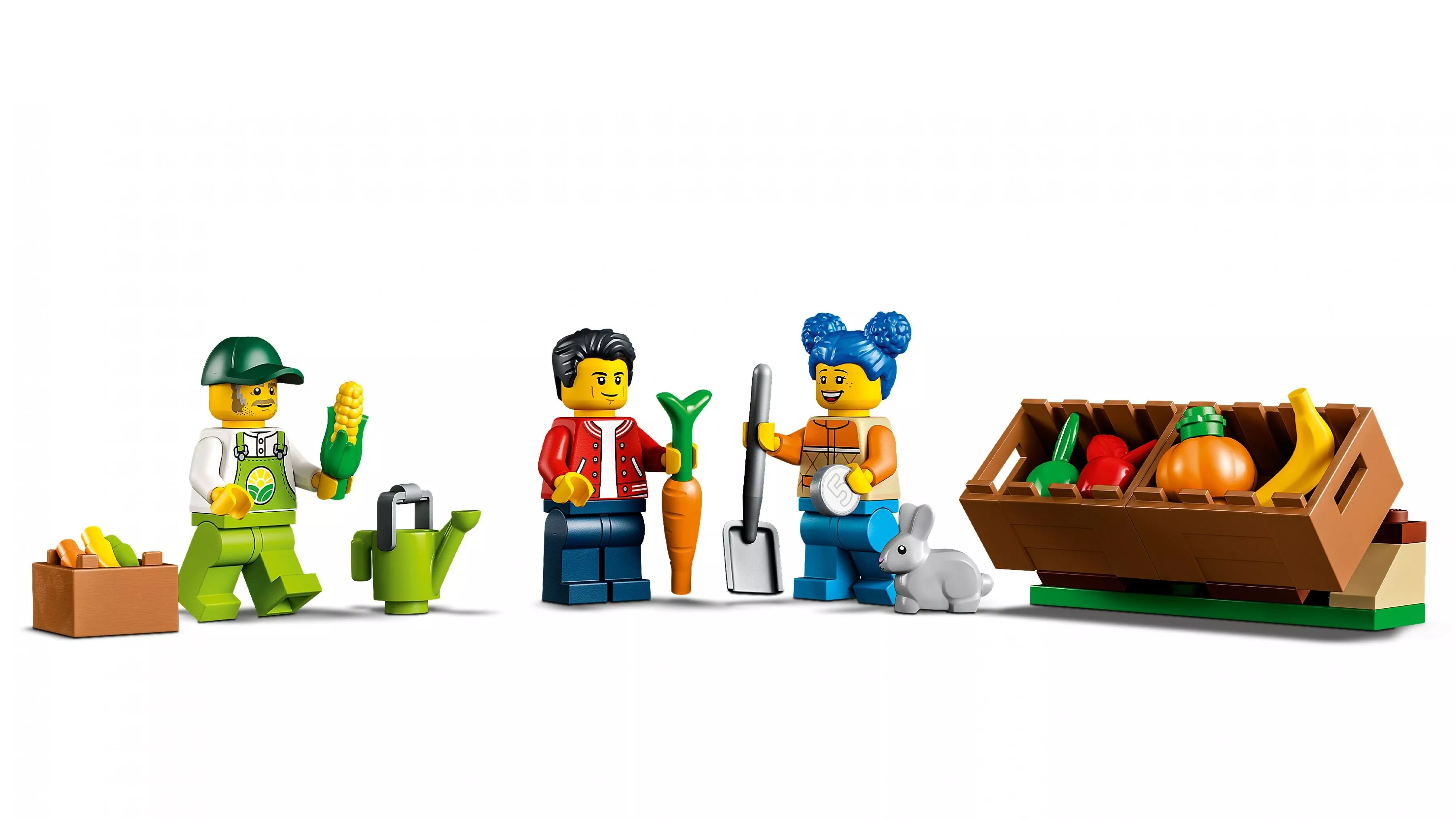 Ура! Открылся фермерский рынок, где можно купить множество свежих продуктов. Помогите фермеру полить и собрать урожай моркови, сладкой кукурузы, перцев халапеньо и винограда. Расставьте ящики на витрине, чтобы у покупателей потекли слюнки, залезайте в передвижной магазин и продавайте овощи из раздвижного окна. Присоединяйтесь к Горацию и его друзьям из сериала «ЛЕГО Сити», чтобы доставлять продукты на дом и веселиться на природе — только присматривайте за голодным кроликом!
