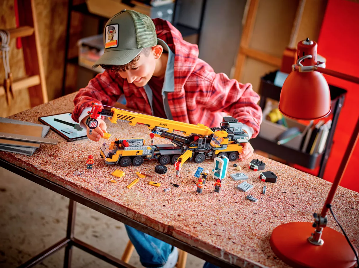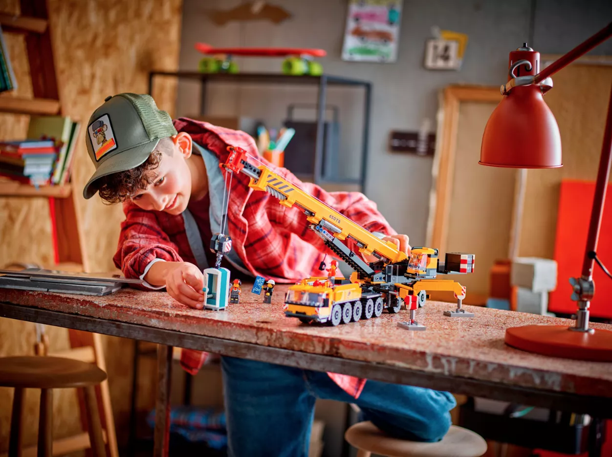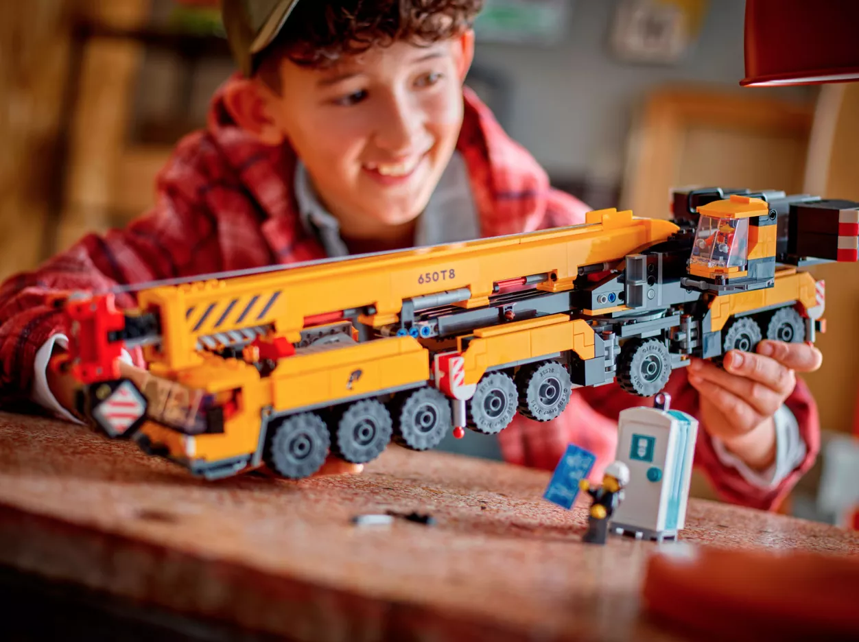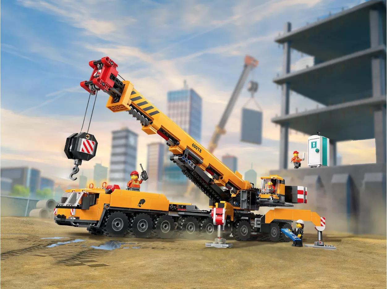 • Игрушки LEGO City, вдохновленные реальными транспортными средствами и машинами: дети могут раскладывать опоры, вращать кабину, выдвигать и поворачивать стрелу на 360 градусов, управлять подъемником.