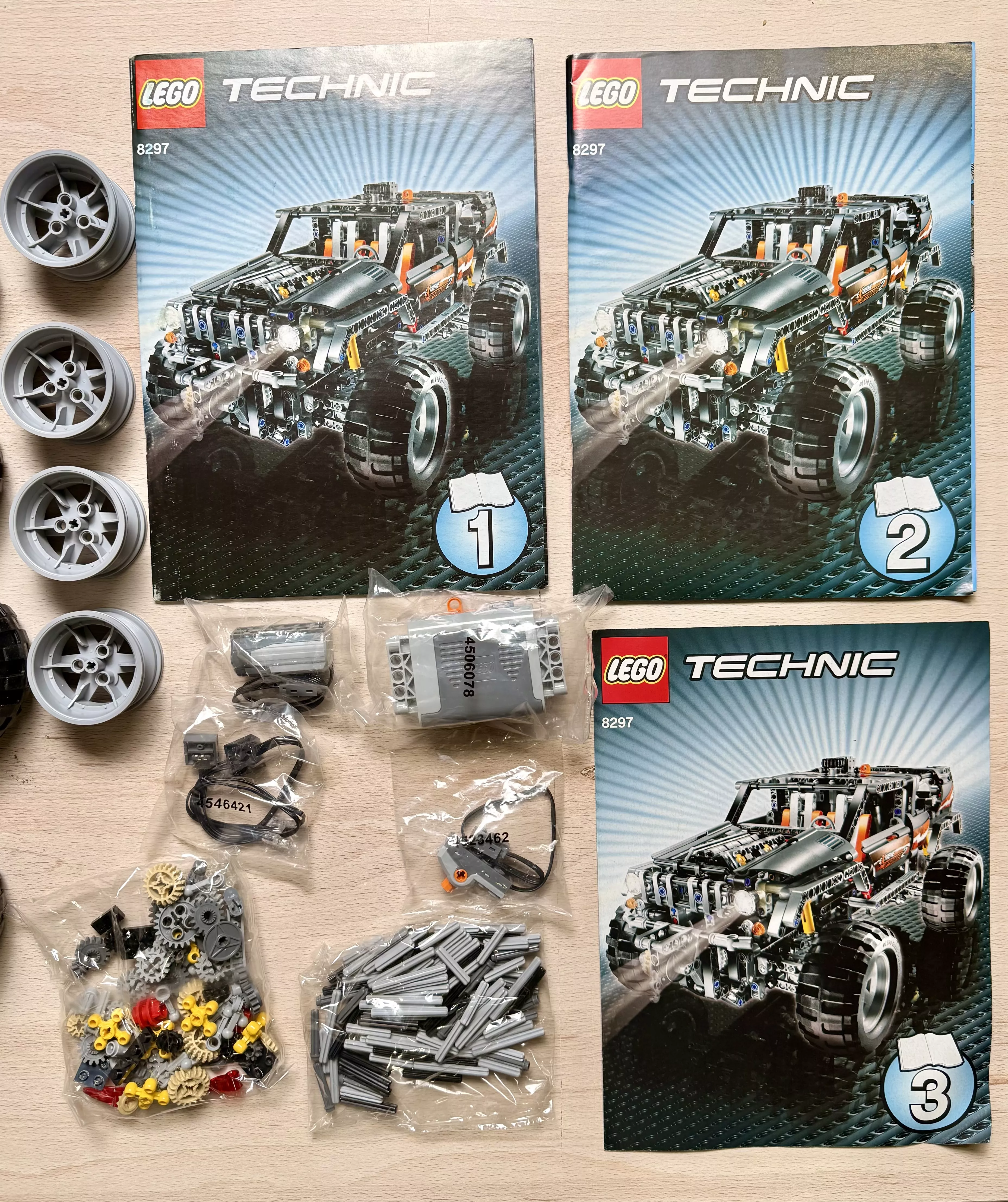 LEGO Technic 8297 «Внедорожник» — это большой и технически насыщенный набор серии Technic, состоящий из 1097 деталей. Он предназначен для сборки массивного внедорожника с реалистичной конструкцией и механическими элементами.
